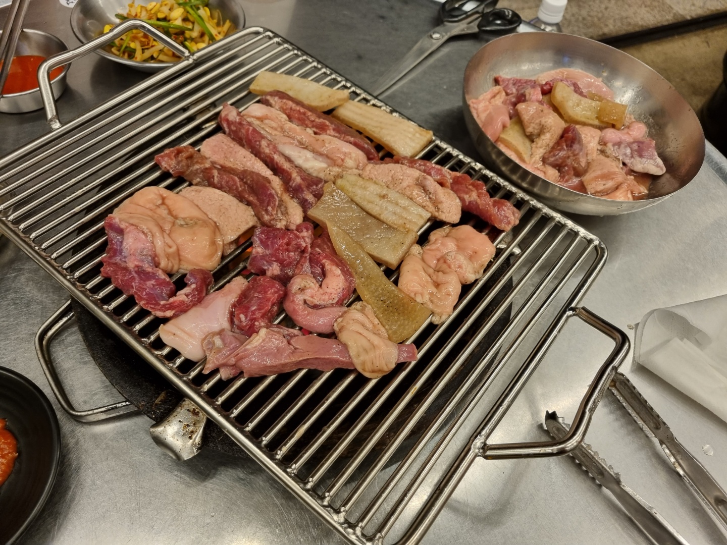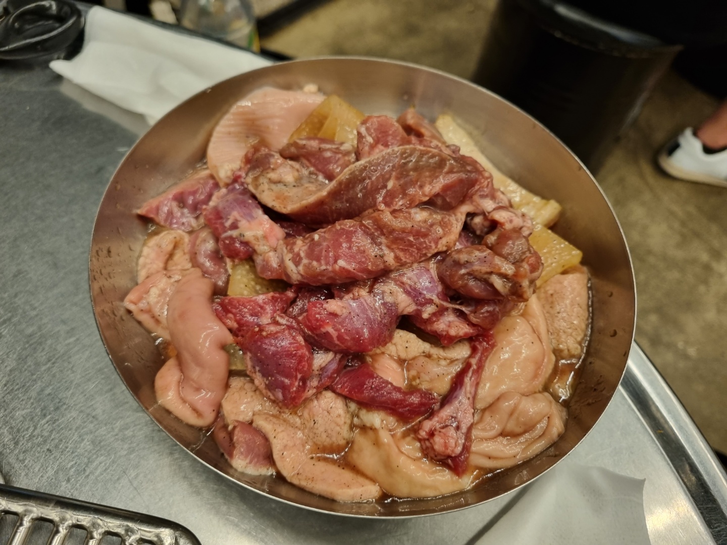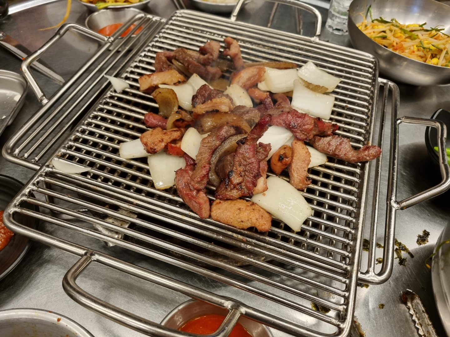 맛있어 보이쥬? 여기서 꿀팁을 하나 더 알려드리자면 아니 두개 더 알려드리자면, 첫번째는 고기를 굽다가 많이 분명히 조금은 탈텐데 홀 담당하는 직원에게 말을해서 탄 불판을 아래에 깔고 새 불판을 위에 올려 덜 타면서 맛있게 먹게 고기를 구워서 먹을수 있고요. 그리고 두번째는 모둠이 어느정도 먹을수 있을 정도 직전 까지 익었다 싶으면 기본으로 제공되는 양파을 올려 한번 부속들과 집게로 살살 저으면서 볶아주세요! 그러면 훨씬 맛있게 먹을수 있습니다^^