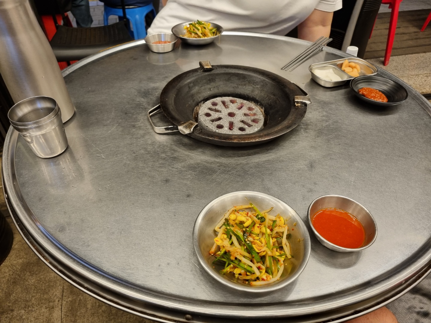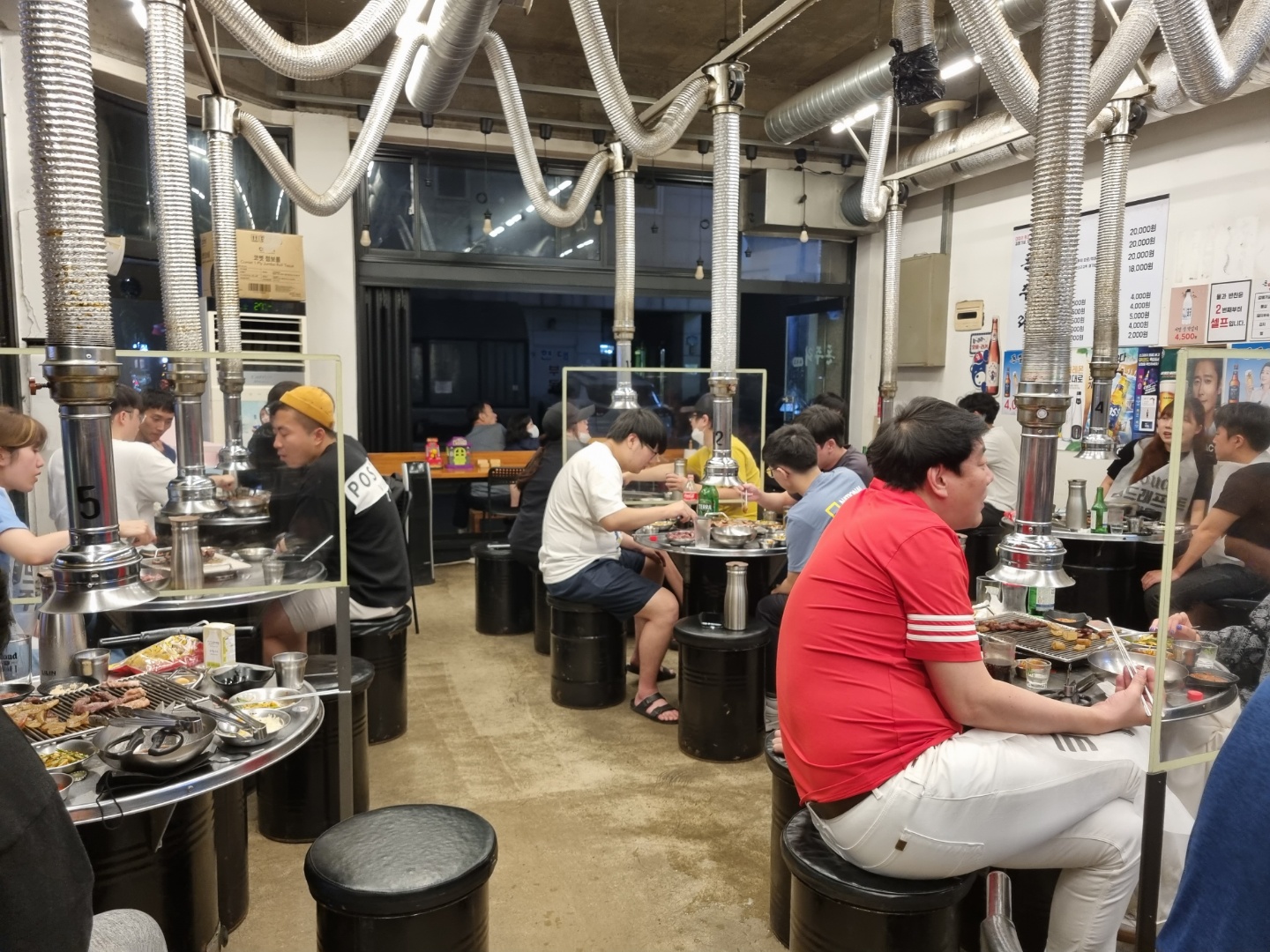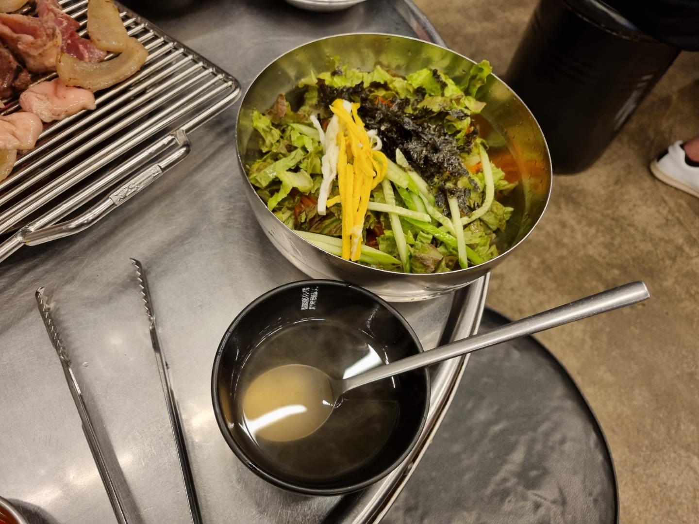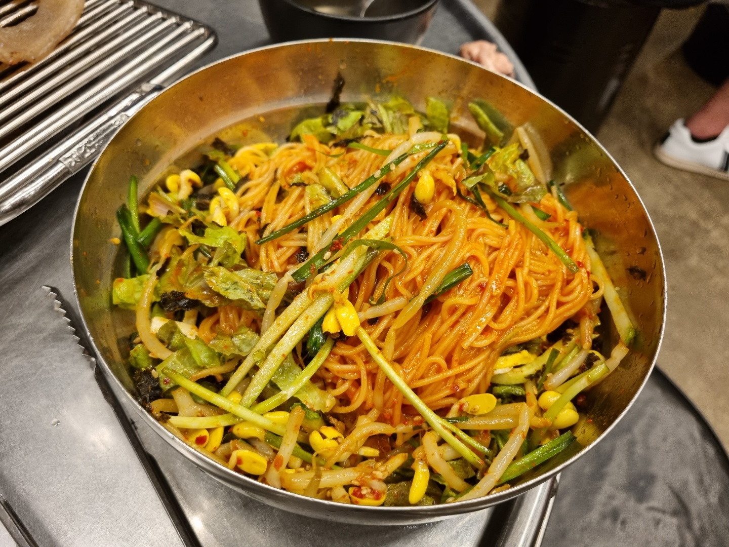 맛있어 보이쥬? 여기서 꿀팁을 하나 더 알려드리자면 아니 두개 더 알려드리자면, 첫번째는 고기를 굽다가 많이 분명히 조금은 탈텐데 홀 담당하는 직원에게 말을해서 탄 불판을 아래에 깔고 새 불판을 위에 올려 덜 타면서 맛있게 먹게 고기를 구워서 먹을수 있고요. 그리고 두번째는 모둠이 어느정도 먹을수 있을 정도 직전 까지 익었다 싶으면 기본으로 제공되는 양파을 올려 한번 부속들과 집게로 살살 저으면서 볶아주세요! 그러면 훨씬 맛있게 먹을수 있습니다^^