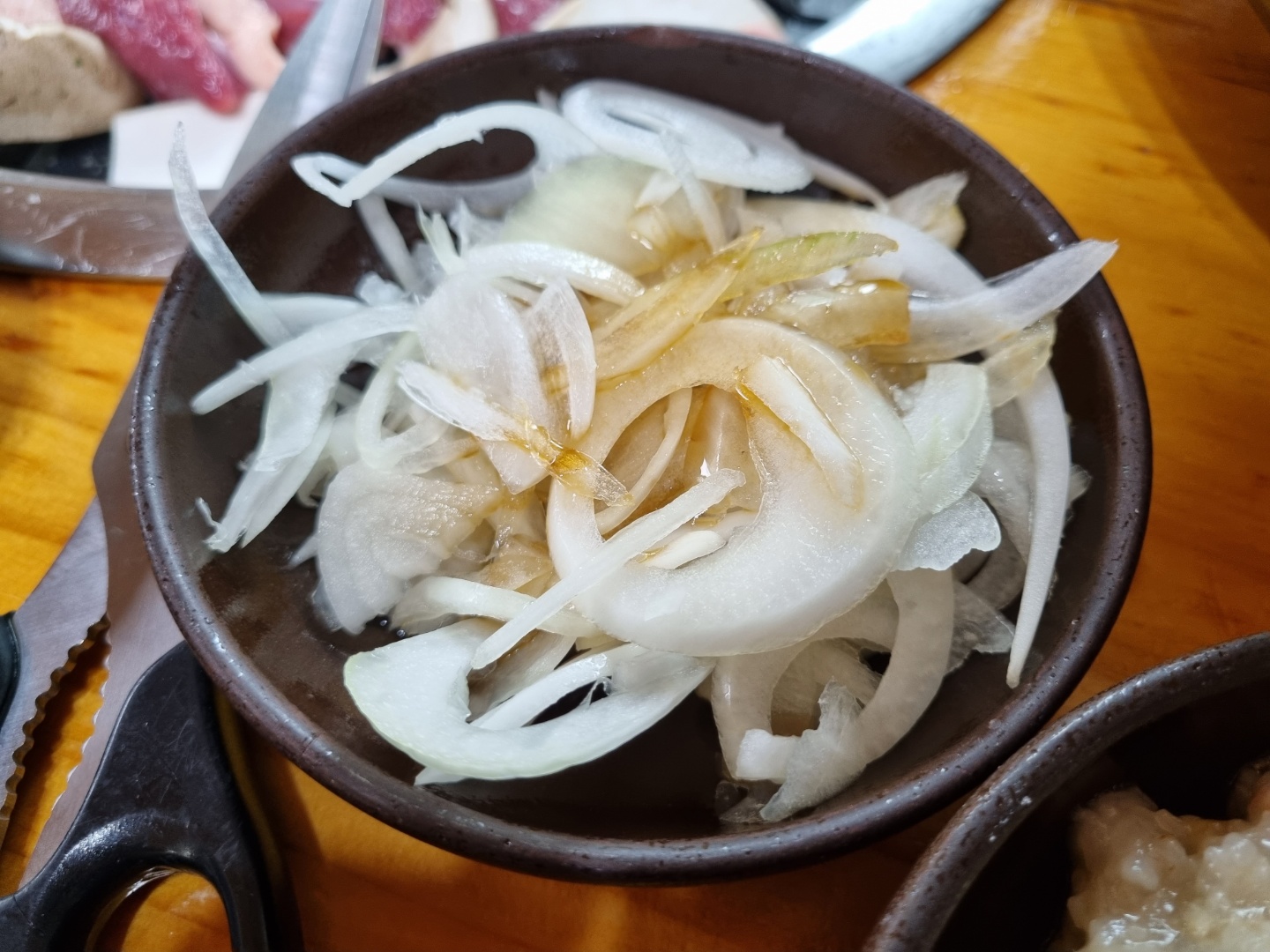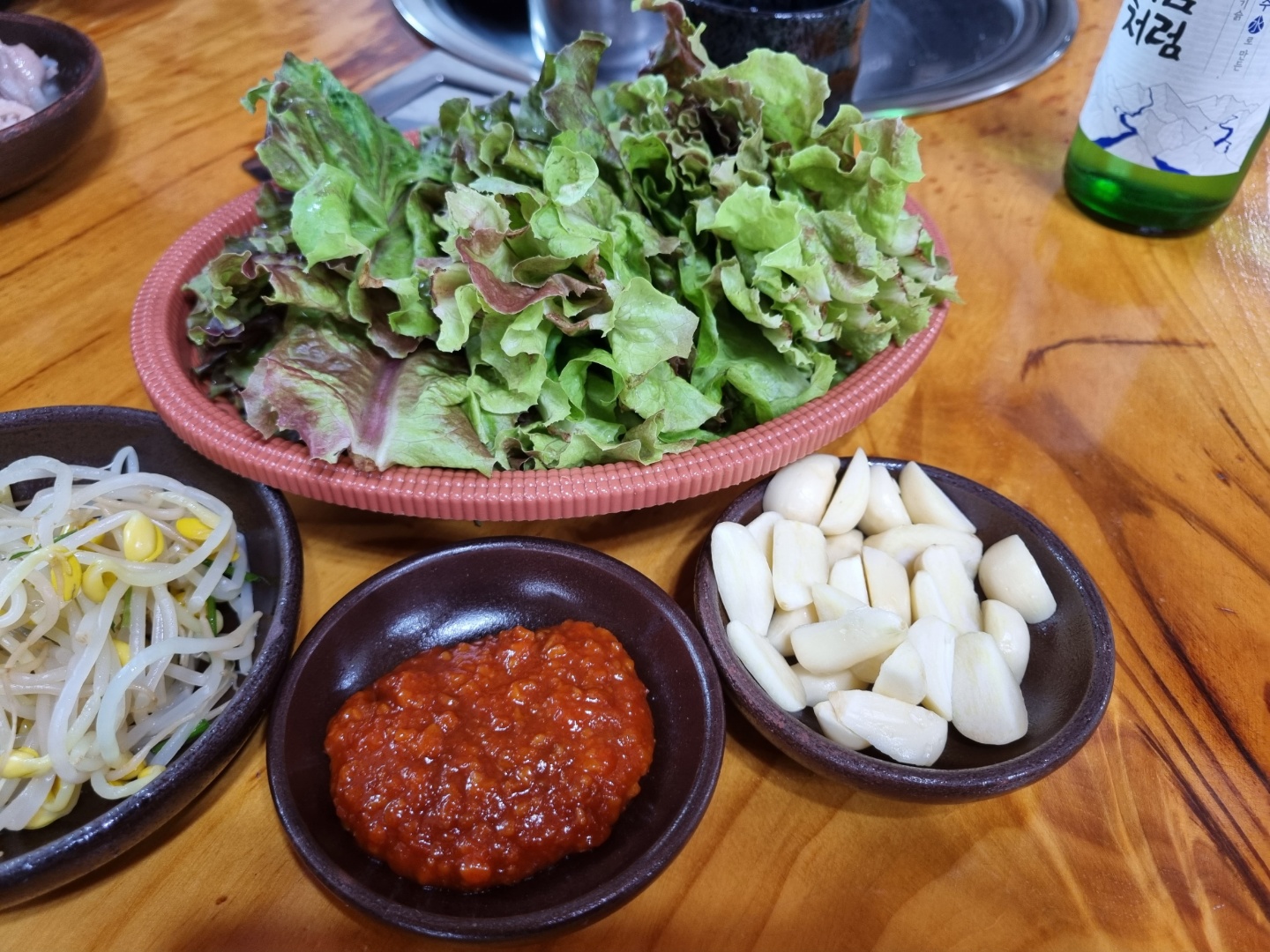 오리 로스를 주문하면, 개인당 1개씩 양파절임과 직접 식당에서 키운것 같은 비주얼의 맛있는 상추와 쌈장과 마늘과 함께 제공해줘요~~~